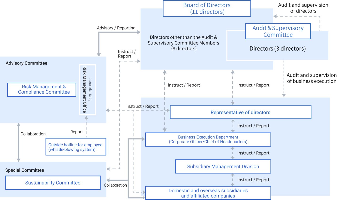 Its Sustainability Committee, which is chaired by CEO, takes the lead in discussing important policies and measures, monitoring progress toward targets, and promoting sustainability initiatives. This is done in collaboration with the Risk / Compliance Committee, business execution departments, and domestic and overseas subsidiaries. The Committee brings up or reports important matters to the Board of Directors, and receives necessary instructions and advice as appropriate.