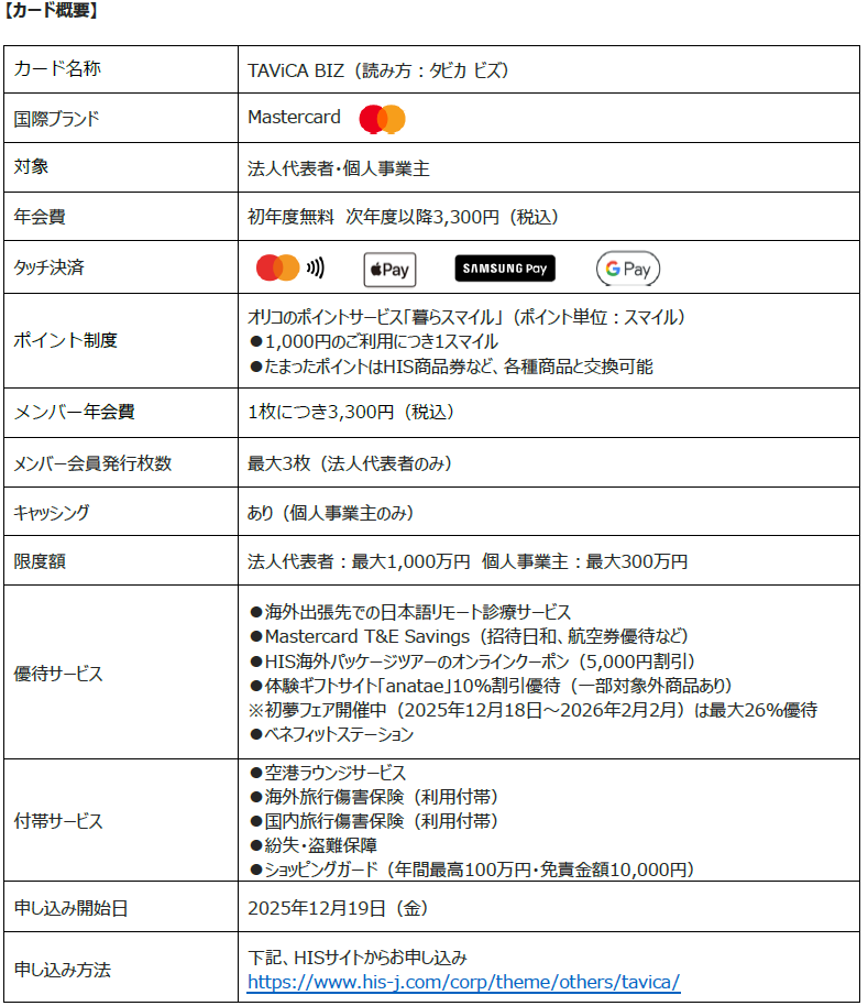 株式会社エイチ・アイ・エス(本社:東京都港区 以下、「HIS」)は、株式会社オリエントコーポレーションとの提携ビジネスカードである「SKY BIZ」をリブランディングし、「TAViCA BIZ」としてカードデザインを一新するとともに優待サービスおよび付帯サービスを追加し、2025年12月19日(金)より新サービスを開始いたします。