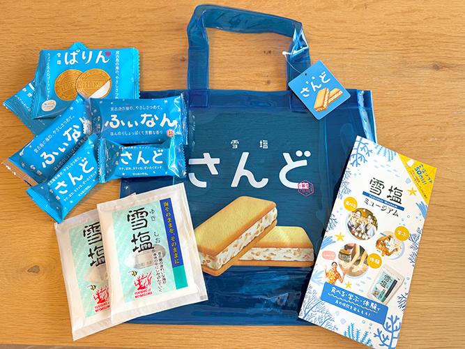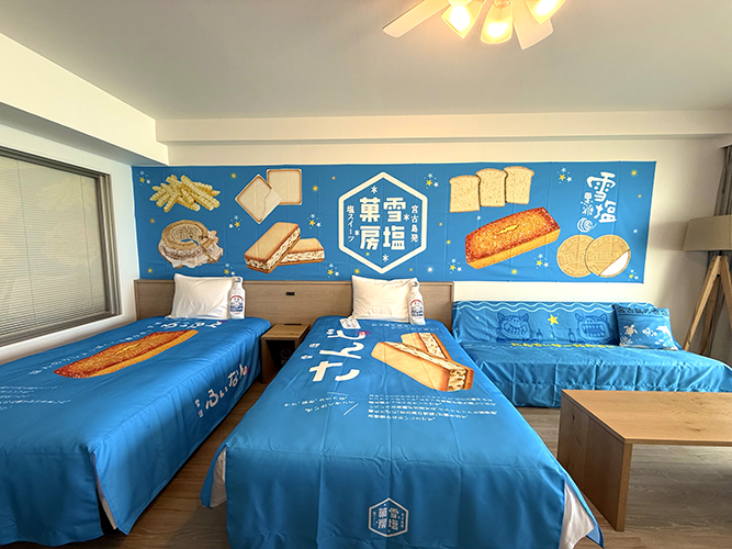 「雪塩ルーム」は、「宮古島の雪塩」をイメージした、ブルーと白を基調とした装飾で、宮古島の雪塩の商品パッケージなどを壁やベッドカバーにデザインし、雪塩のつくりかたをご紹介したタペストリーをご用意しています。ご宿泊のお客様には、雪塩菓房の雪塩スイーツ、雪塩パウダー、雪塩ミュージアムでご利用いただける雪塩ソフトクリーム50円割引券、雪塩さんどのクリアバッグをプレゼントします。また、ホテル内Restaurant HoKuLaNi特製の、ホテルオリジナル雪塩パンナコッタをご提供します。
