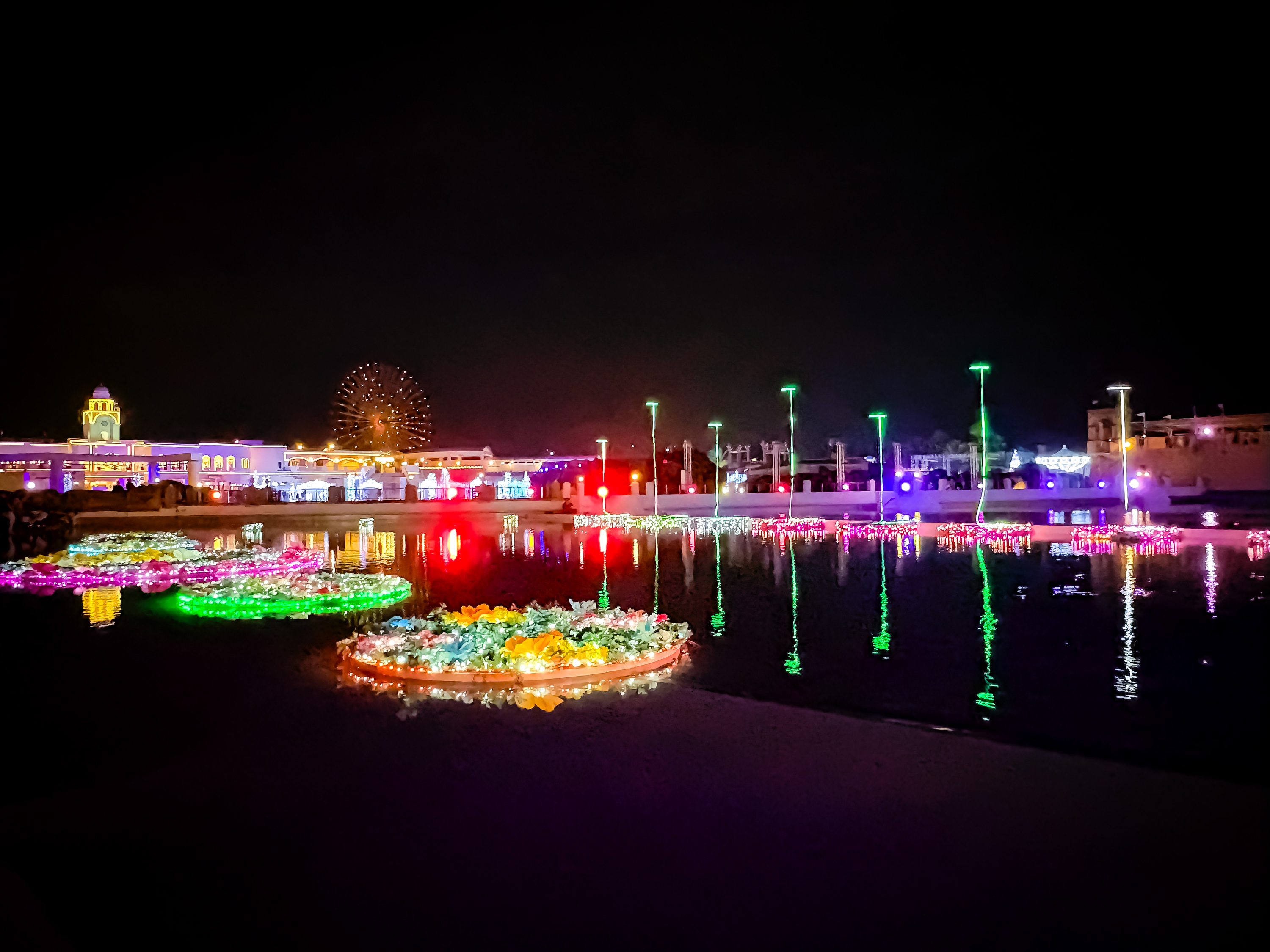 また、豪華な演出だけでなく、しっとりとした美しさも大切にしています。例えば、ジョイアマーレの浜辺に設置した「光の花手水(はなちょうず)」です。これは日本の伝統的な美意識とイルミネーションを融合させたもので、水面にゆらめく光を愛でるという、ラグナシアならではの体験を形にしました。最新技術での驚きと、こうした心に響く情緒的な演出の両方があることで、多角的な感動を提供できると考えています。